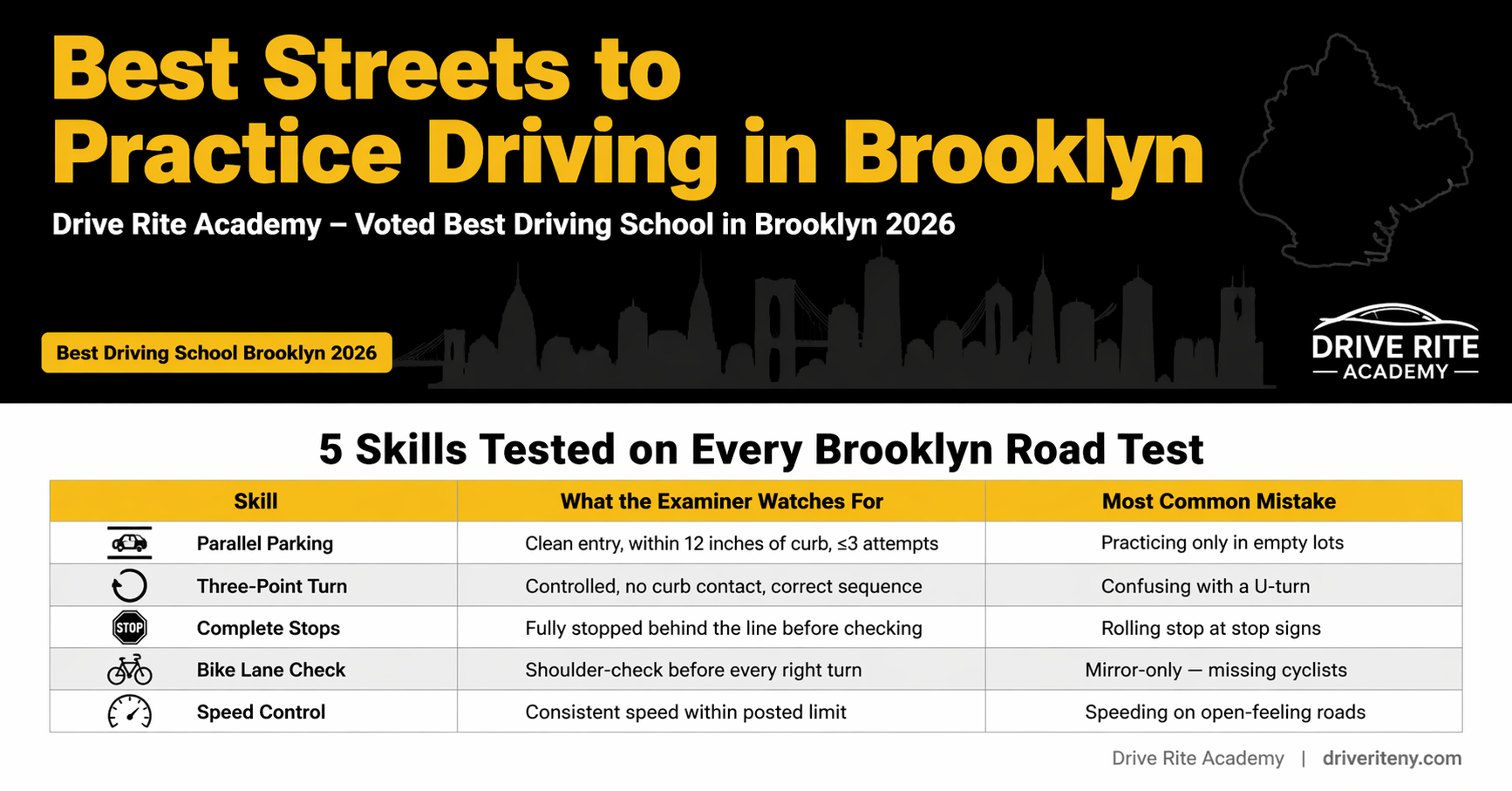 Important: New York DMV regulations prohibit practicing on active road test routes. Drive Rite Academy instructors focus on skill-building across Brooklyn neighborhoods — not route familiarization. This is the correct and legal approach to test preparation.