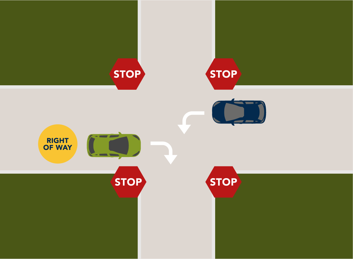 Now, what if four cars decide to show up fashionably early at the same time? It's like a traffic party, right? Fear not, my friend! In this delightful scenario, the right-of-way politeness prevails. Picture a synchronized dance where each car takes its turn to glide through the intersection. It's a courteous waltz where everyone gets a chance to shine.